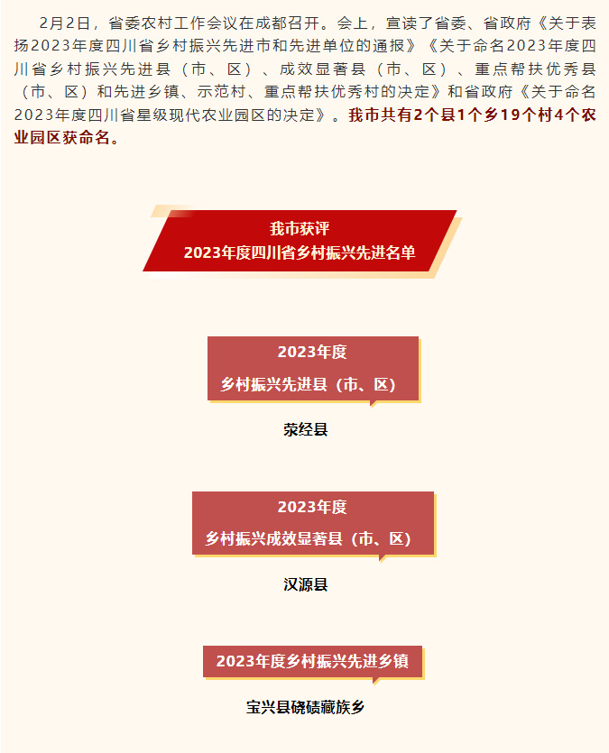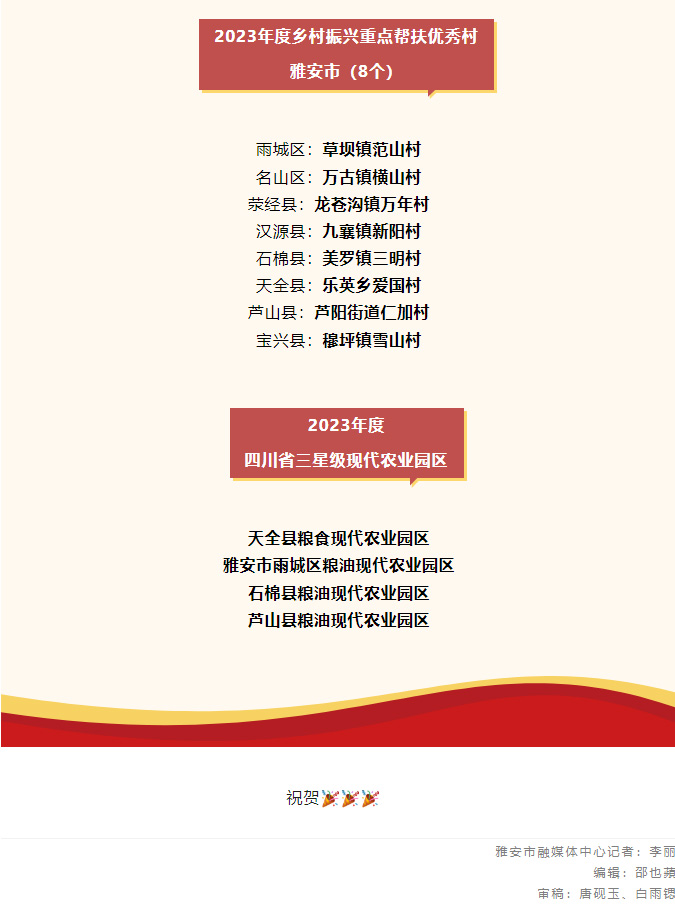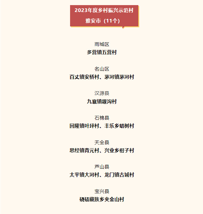 2023年度四川省乡村振兴先进名单出炉,雅安2县1乡19村4园区获命名