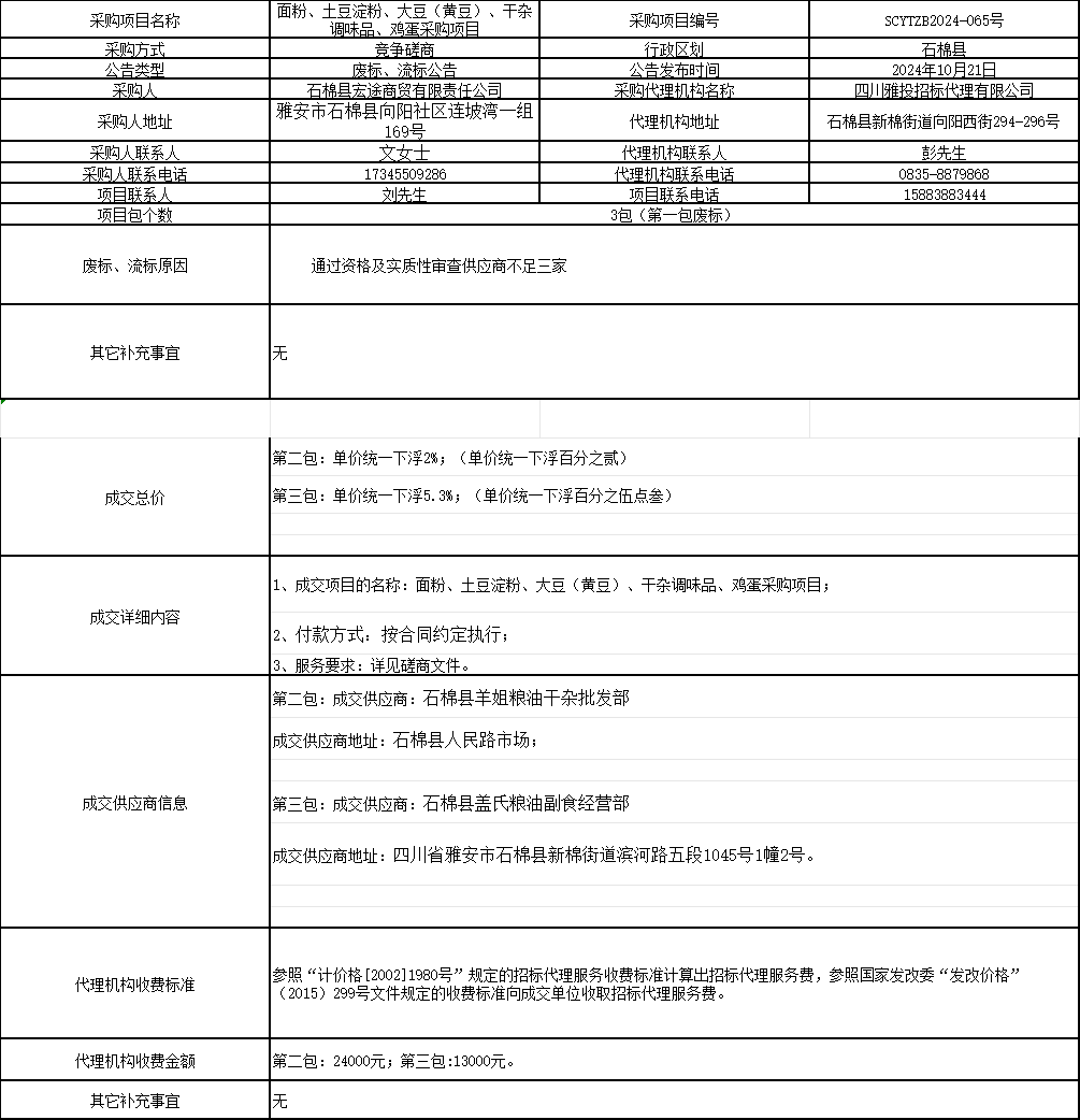 面粉、土豆淀粉、大豆(黄豆)、干杂调味品、鸡蛋采购项目废标、流标公告