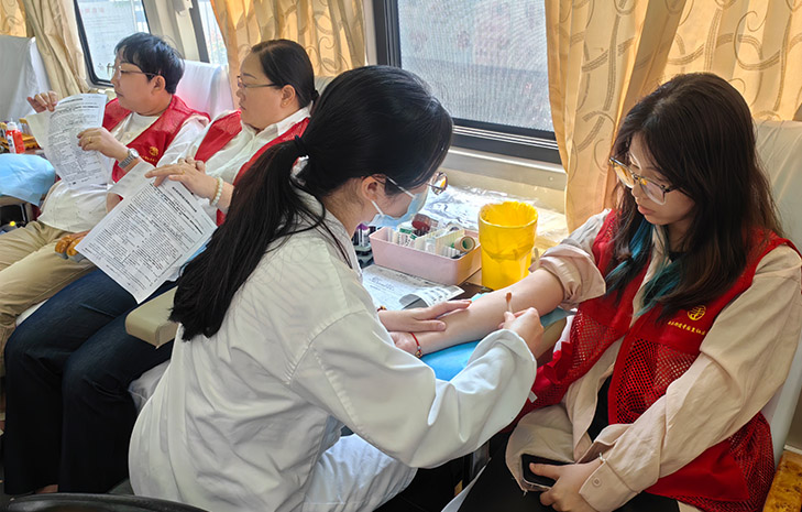 当天上午,j9国际站官网入口志愿者和两新党支部志愿者一起,在工作人员的引导下,有序完成填表、量血压、测血型、初筛化验。检测合格的人员,排队依次进入采血车,一个个麻利地挽起袖子,开始献血。医务人员耐心采血的同时,还不忘告知献血常识,叮嘱大家献血注意事项。听着医务人员的“唠叨”,献血过程好像开启了加速度,我们其中一个志愿者在采血300ml后说:“怎么这么快,没什么感觉,我好像还可以再献一次”。采血车上的人齐刷刷地朝向她这里,“你这么豪”,“你太狠了”,“哈哈”,“……”,瞬间整个采血车充斥着笑声一片,医务人员也开心一笑,“下次再来”。